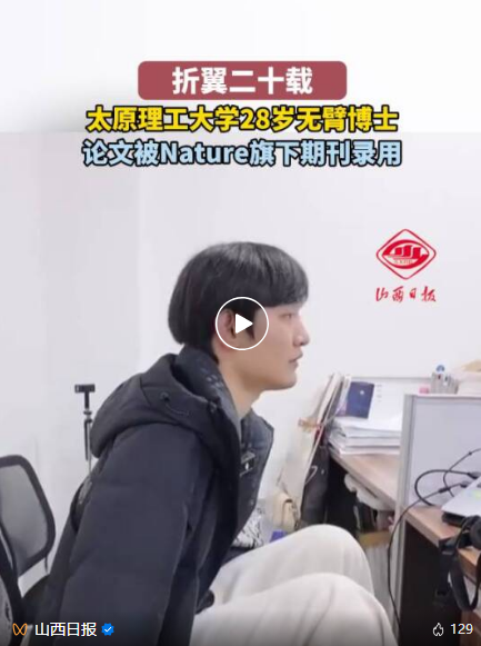 截至3月1日,28个作品、84.1万点赞、6.4万粉丝。近日,王海港的抖音号“风物长宜放眼量”火了。王海港是太原理工大学数学学院博士三年级学生,他平静地分享着学习、科研、生活的日常,却引发了全网的刷屏与致敬。他的不同,源于8岁那场夺走他双臂的意外。20年来,他用坚韧的双脚,不仅丈量着科学的星辰大海,更踏出了一条震撼人心的励志征途。