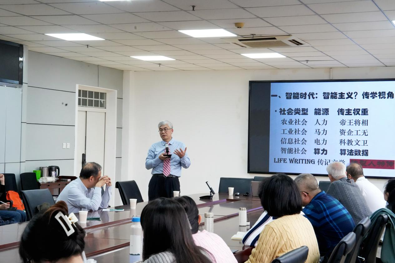 赵白生教授从青年时代起,就专注致力于传记文学研究,是北京大学外国语学院的教授、博导,也是多所中外知名大学的兼职教授、研究员、客座教授等,专著、合著、编著、译著有《严复:难为世界人》《生态学与生命写作》《东方作家传记文学研究》《哈佛读本》《传记文学理论》《肖像》《元首传》等众多著作。讲座伊始,赵白生教授结合逆全球化的时代背景,指出中国文学研究亟须打破固有框架,将中国文学置于世界文学的整体视野中开展双向考察,实现中外文学研究的融通互鉴。针对人工智能全面渗透的时代浪潮,他系统提出“智能主义”核心思想体系,将人类社会划分为农业、工业、信息、智能四大发展阶段,剖析了不同社会形态下“传主权重”的变迁,批判了当下仍沉迷于帝王将相叙事的创作误区,强调智能时代的文学研究必须紧扣算力驱动的时代内核,关注人工智能领域的创新人物与核心思想。