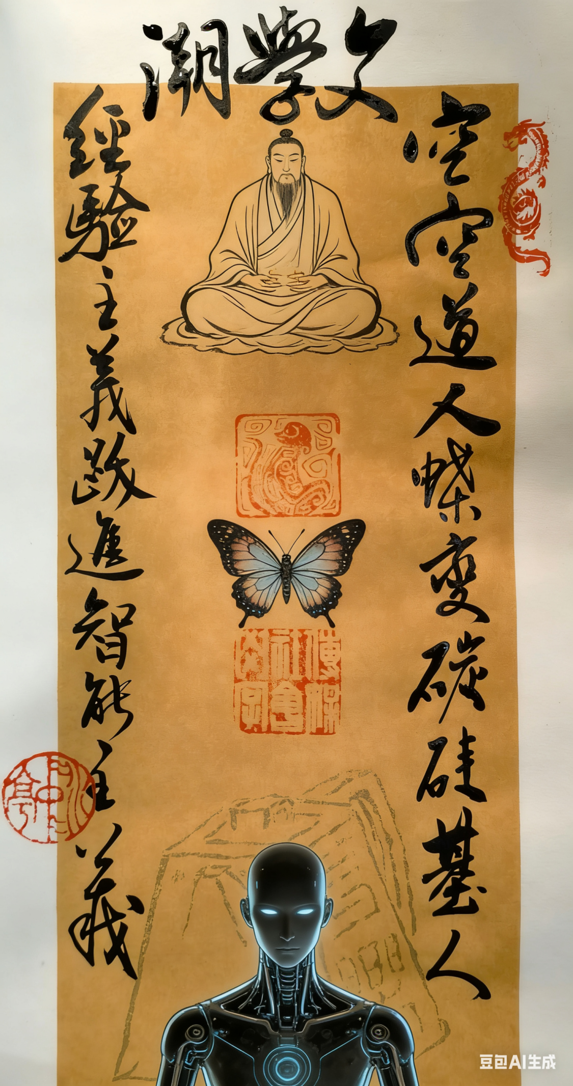 (创意书法人、传媒社会学研究者徐文胜聆听本次讲座后创作了书法并生成AI图和相应视频:文学潮 空空道人蝶变碳硅基人 经验主义跃进智能主义)