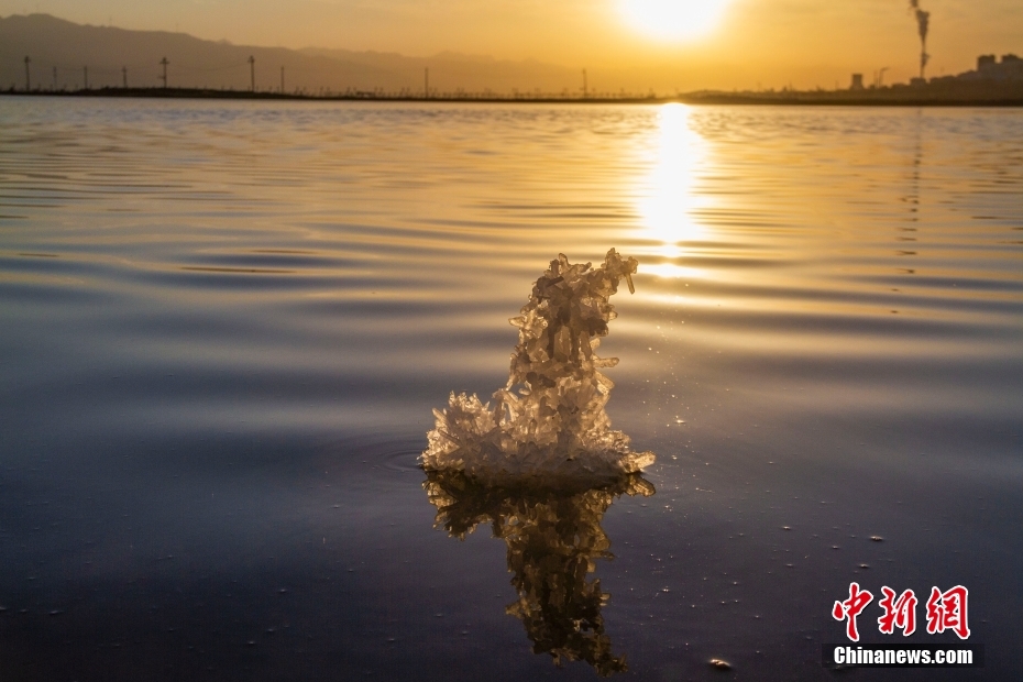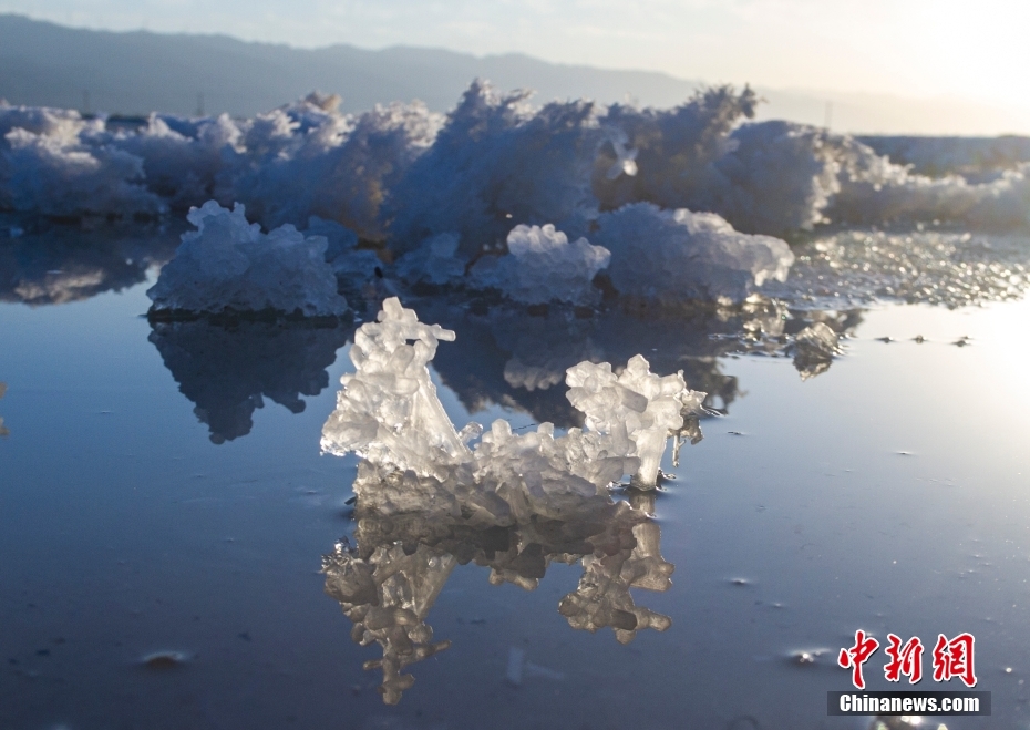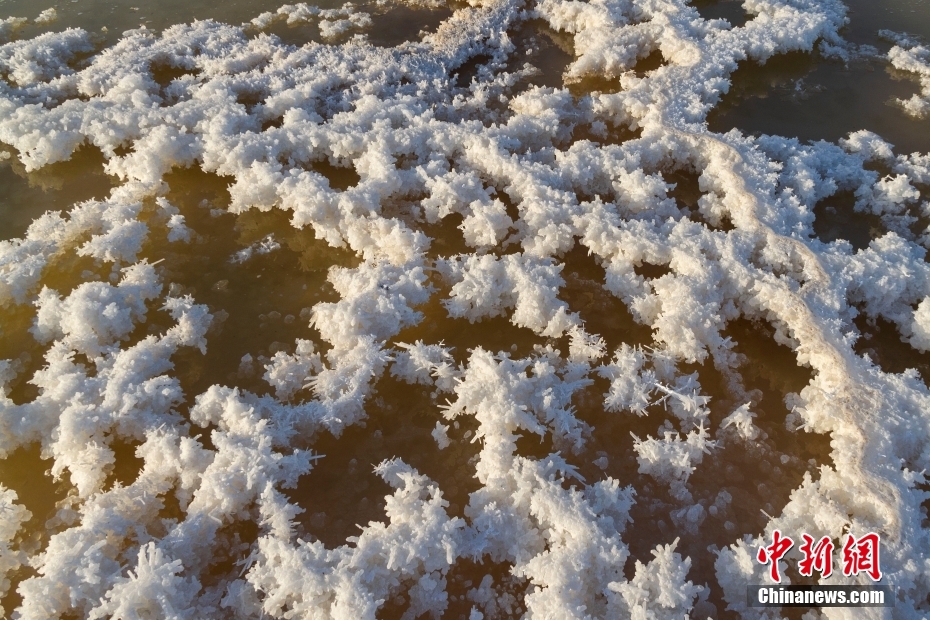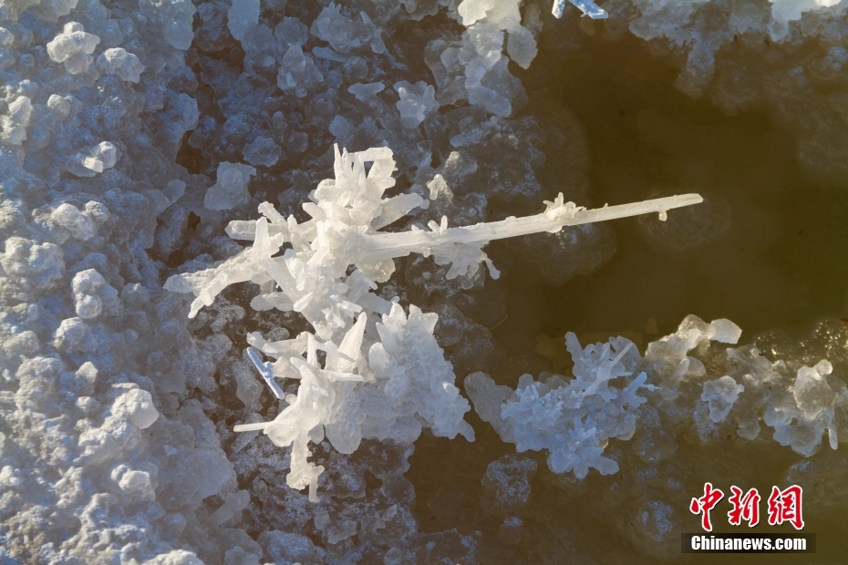 12月22日,在山西省运城市盐湖景区内,湖水中含的硫酸钠在寒冷的冬季形成了形态各异奇特的“硝花”,为冬日增添了一道景色。