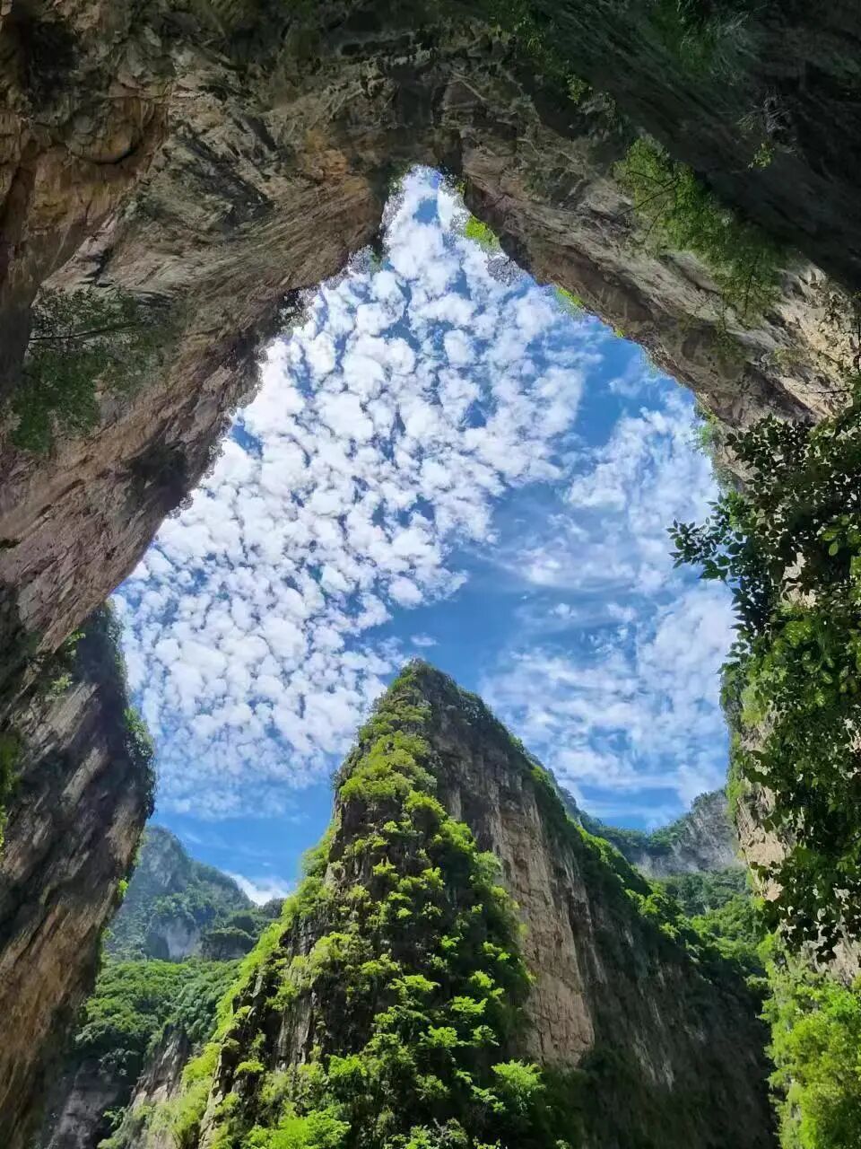 不同的时间和季节,光线在这里呈现出不一样的变化形式,河水的颜色也会随之改变,有时清,有时深,有时淡,有时浅,石桥之上走过的游客驻足停留,目睹八泉峡的绝美风光。游船码头旁是著名的心形峡谷,这是一处自然奇观。两侧山峰环抱,人站在翠绿的岩壁下,抬头望去,远处的山峰与蔚蓝天空恰好构成一个爱心的形状,成了一处峡谷奇观,这里仿佛用自然的力量在赞美坚如磐石的爱情。每个人都在仰头望向天空,在这里,天空和峡谷之间形成了一个倒立的心形,这一独特的地貌,是八泉峡最著名的地标之一。