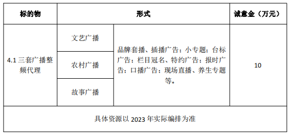 山西广播电视台拟对2023年1月1日-2023年12月31日广播广告进行资源公示。根据《广告法》和国家相关法规允许在广播媒体播放广告并符合山西广播电视台相关管理规定的企业,均可报名参与投标。