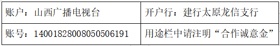 2、报名方式:有意参加山西广播电视台广播广告招标的单位或公司,12月17日15:00之前请按照意向标段对应金额缴纳投标诚意金,并将汇款单据电子版与其它电子版投标文件一并打包发送至报名邮箱:806271019@qq.com;