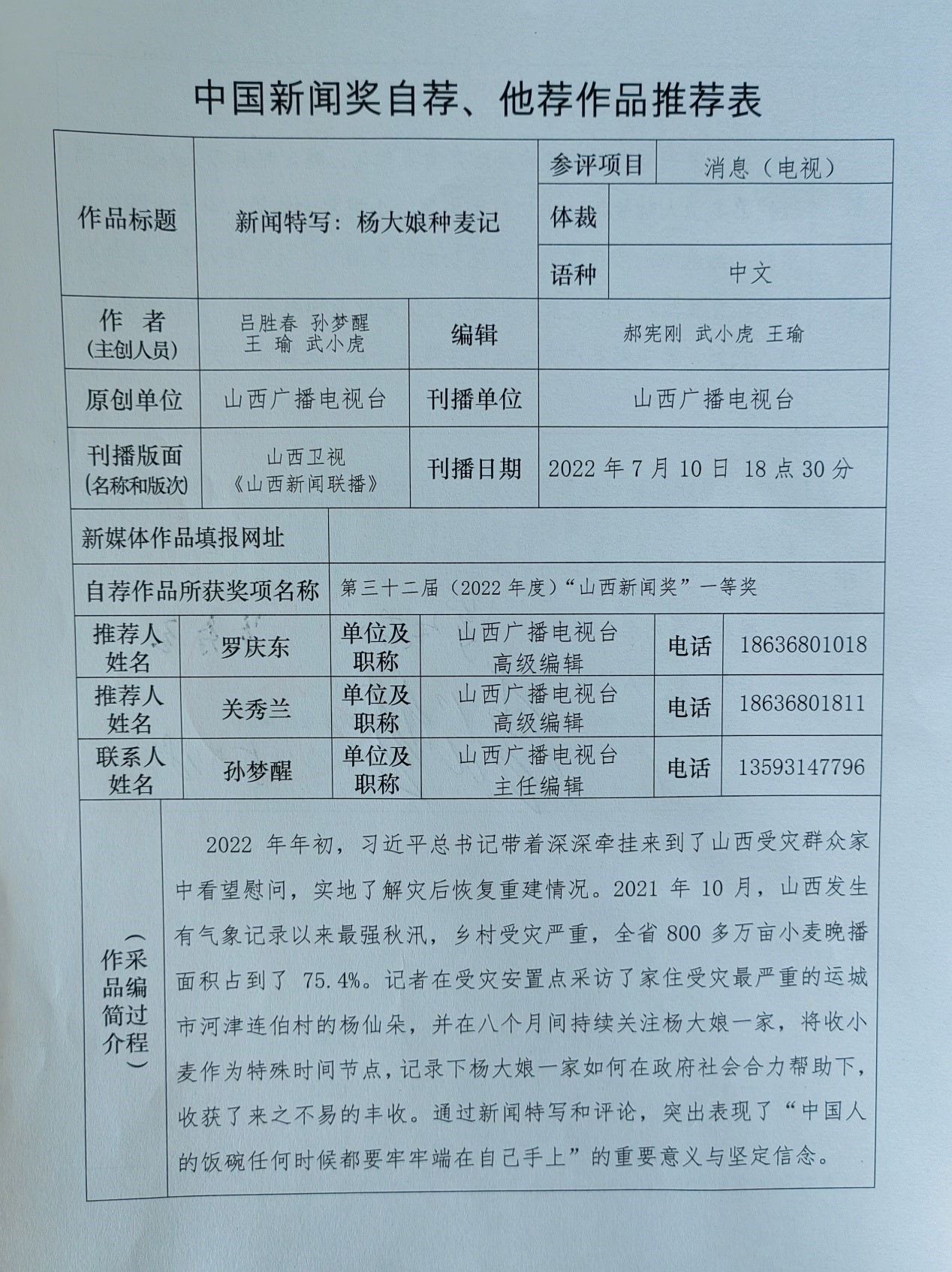 2022年7月10日山西卫视《山西新闻联播》播出的电视消息《新闻特写:杨大娘种麦记》拟按自荐(他荐)方式参评第三十三届中国新闻奖。