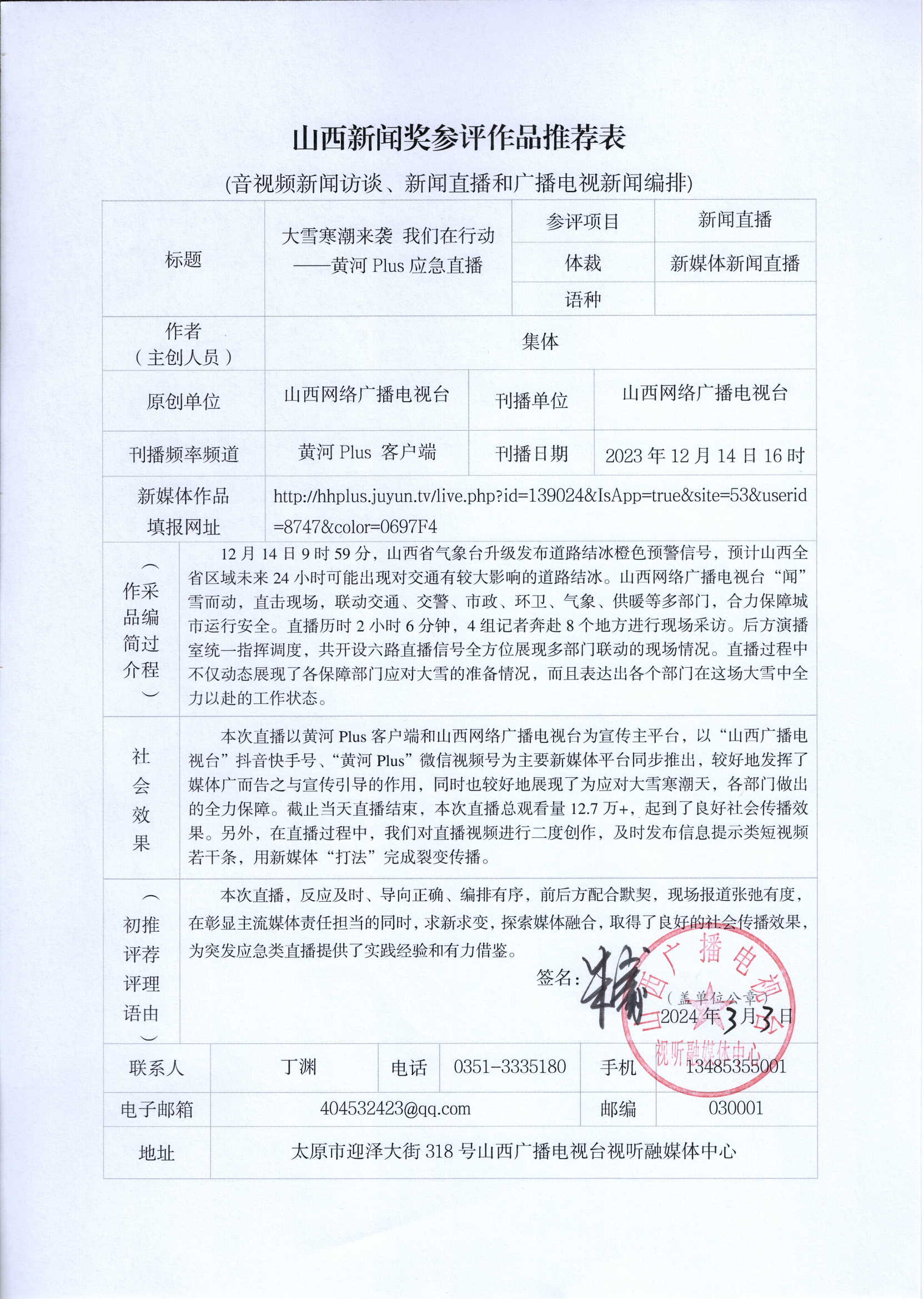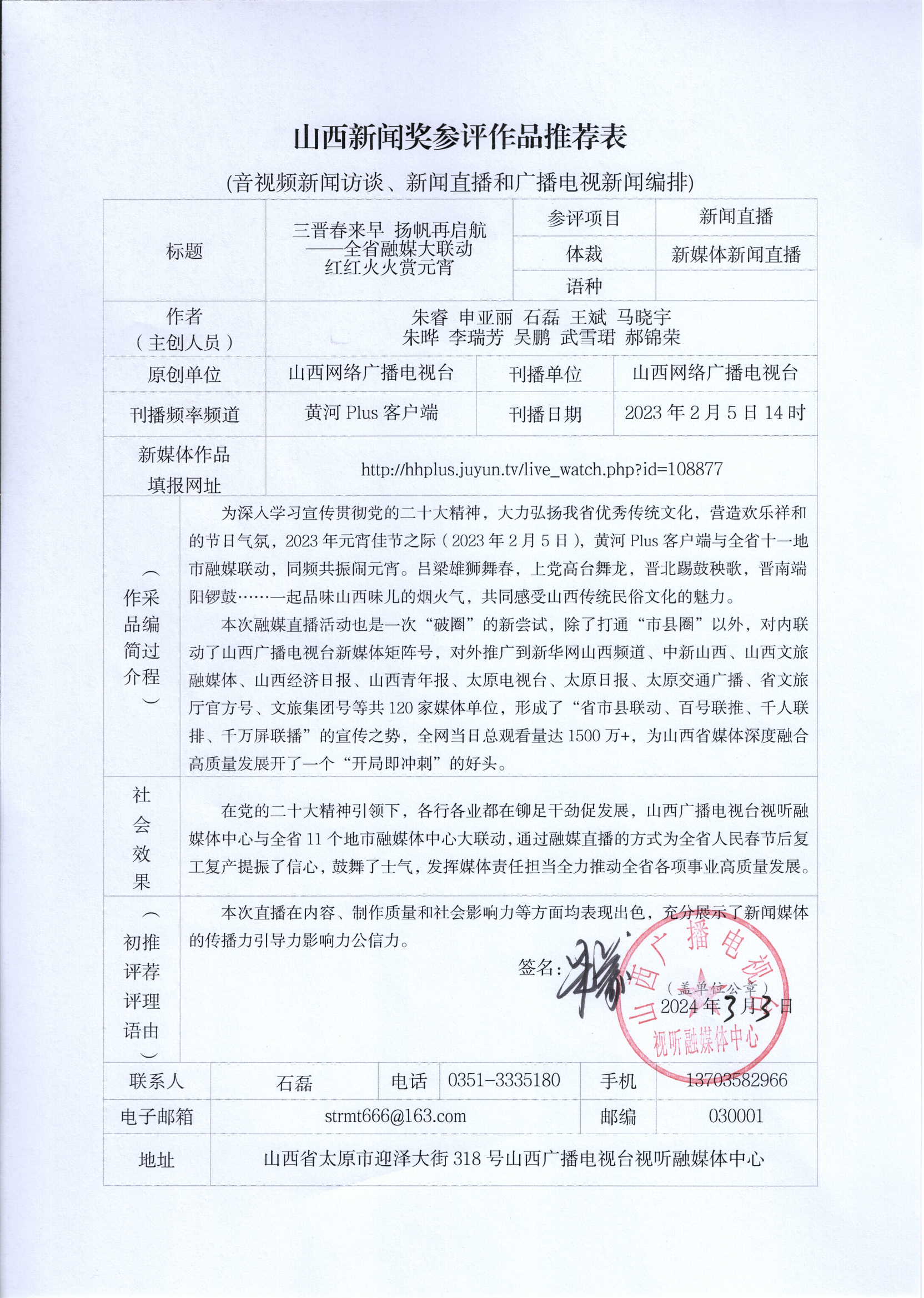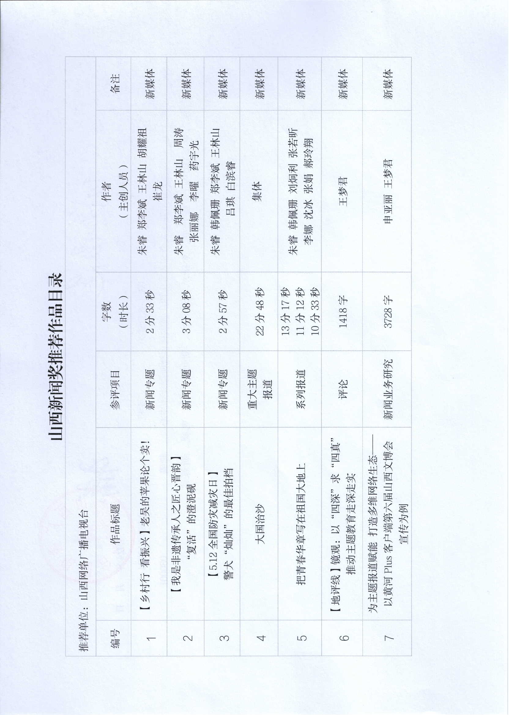 根据山西省新闻工作者协会【2024】1号《关于开展第 33 届山西新闻奖评选的通知》文件精神,山西网络广播电视台推荐7件新媒体作品(包含1件新闻业务研究作品)、4件融合报道应用研究作品和3件新闻直播作品参加第33届山西新闻奖初评,现予以公示,公示期为2024年3月4日至3月8日。如有异议,请与山西网络广播电视台联系,联系电话0351—8301112。