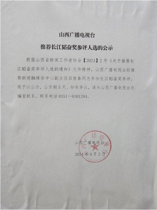 山西广播电视台推荐长江韬奋奖参评人选的公示