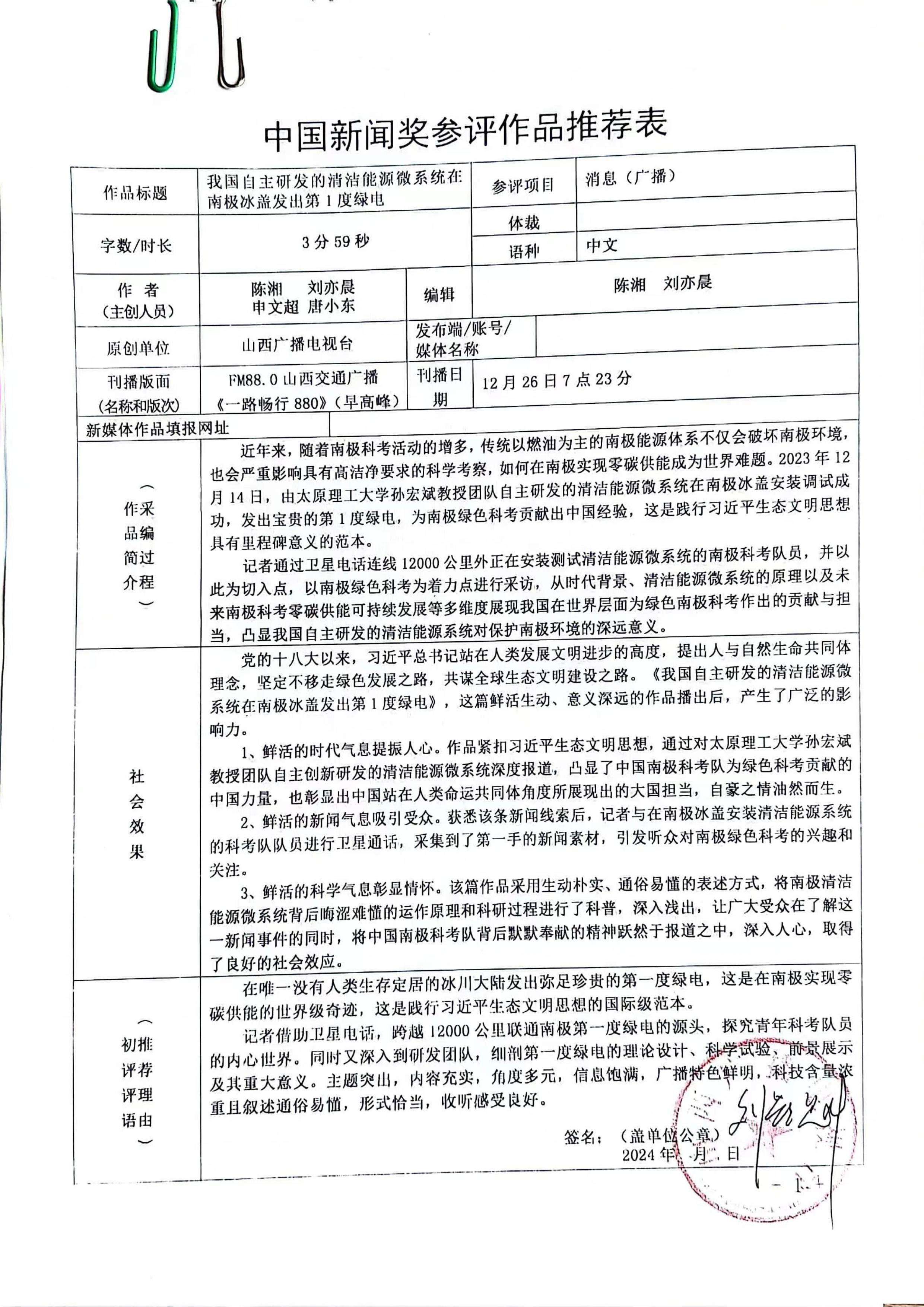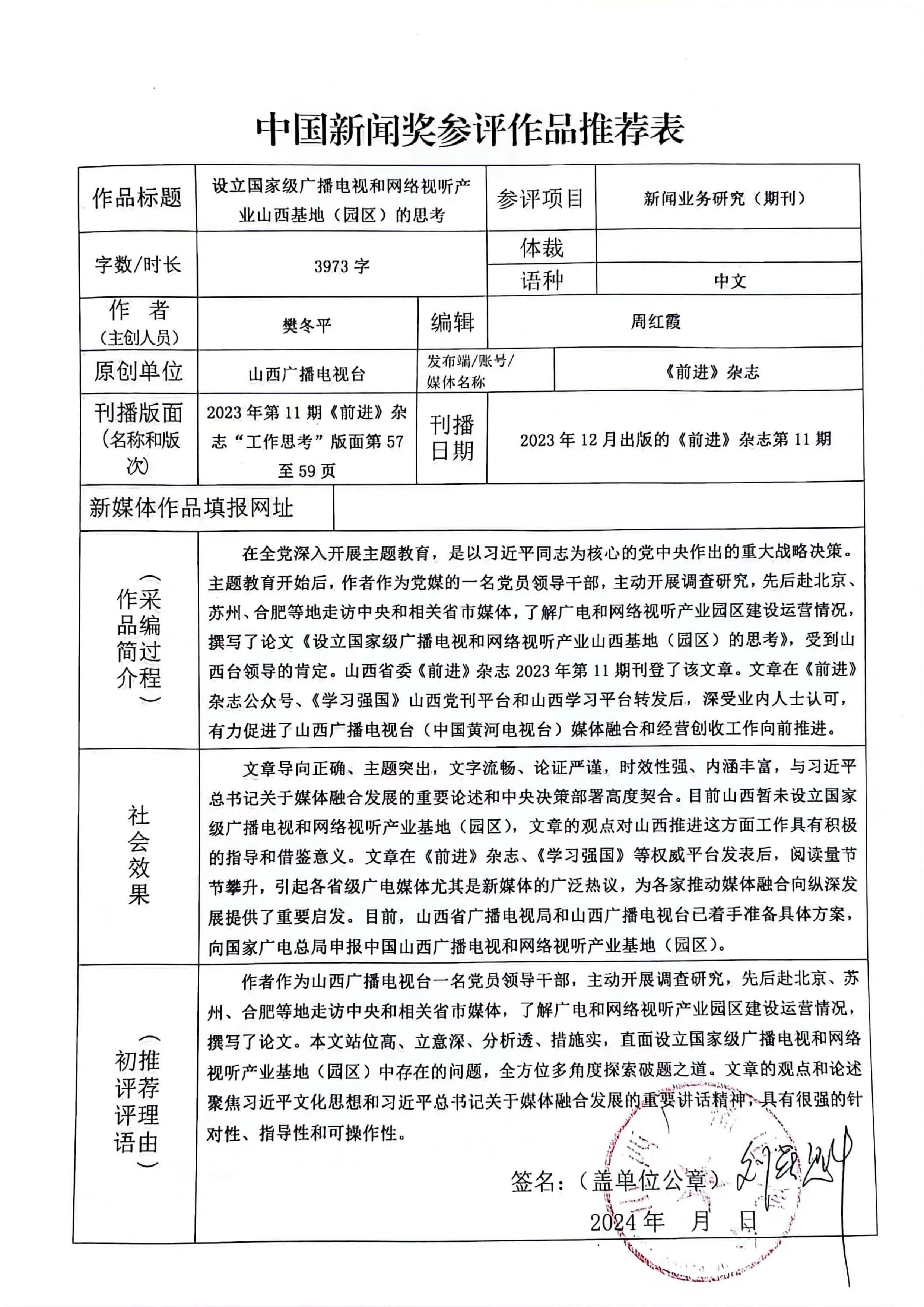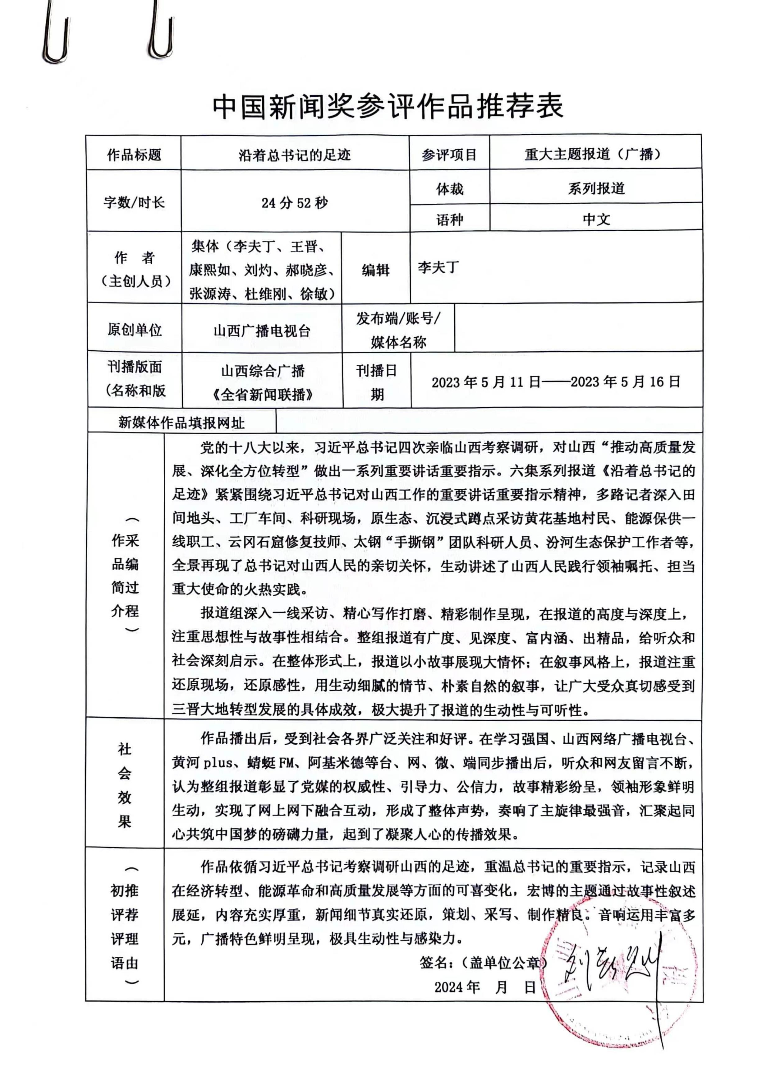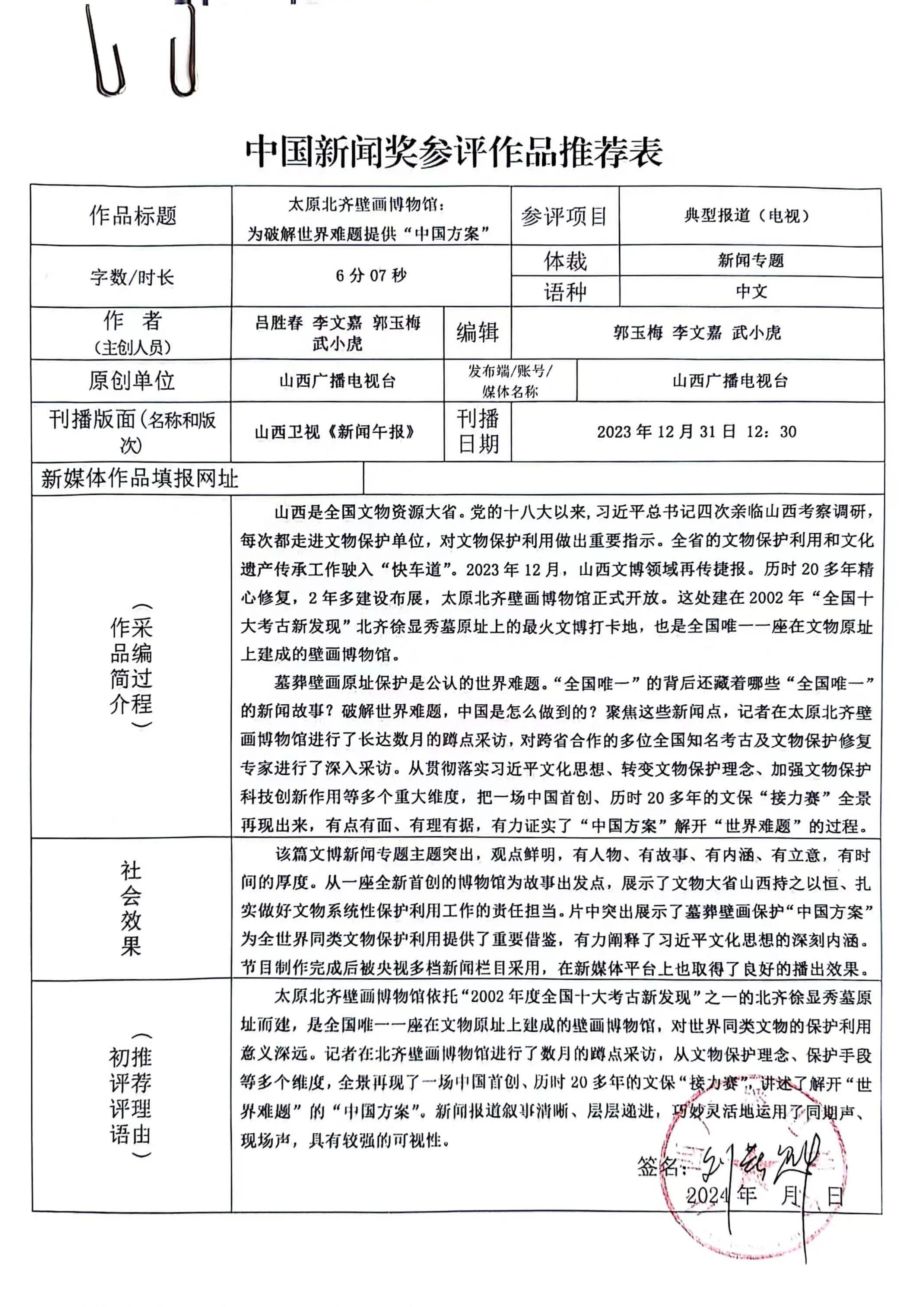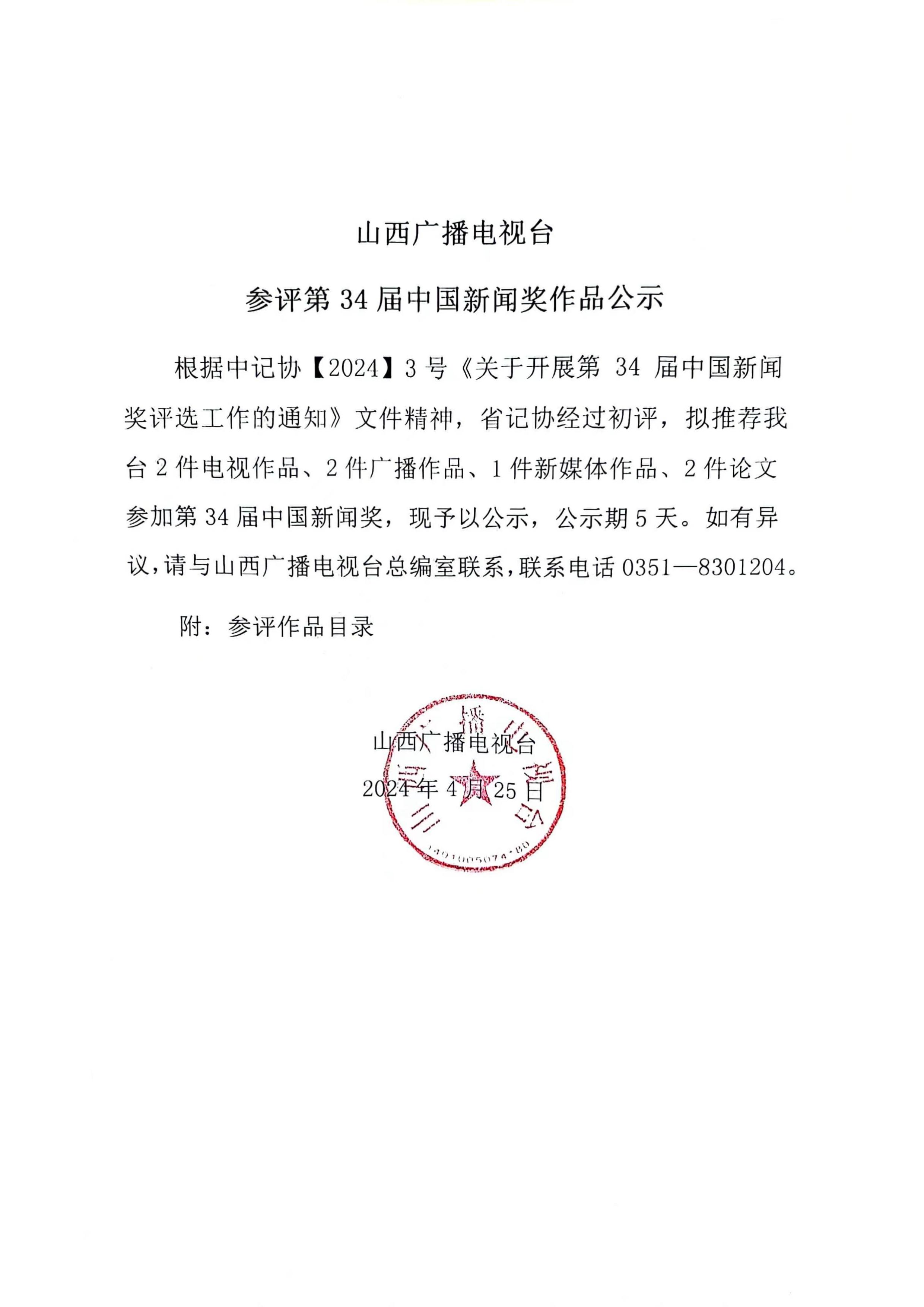 山西广播电视台参评第34届中国新闻奖作品公示