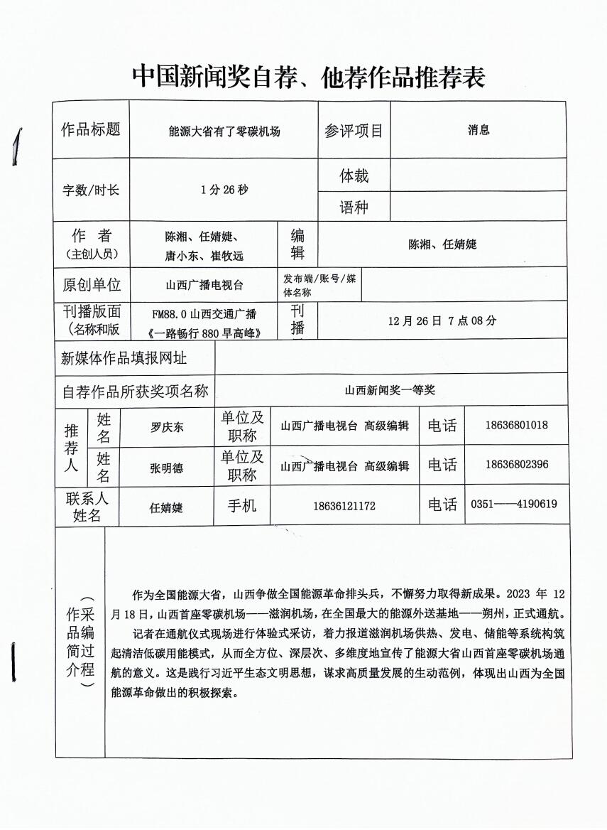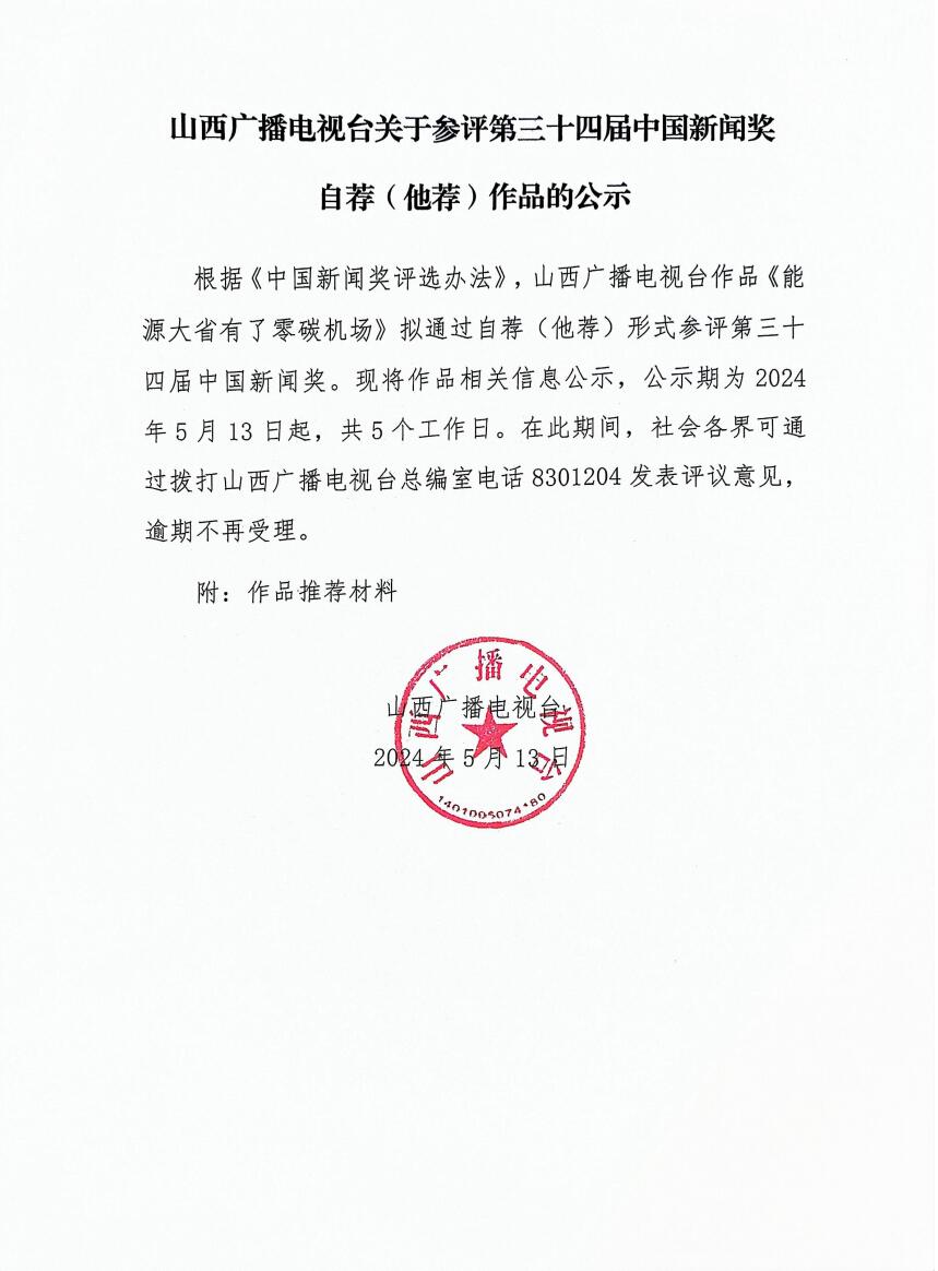 山西广播电视台关于参评第三十四届中国新闻奖自荐(他荐)作品的公示