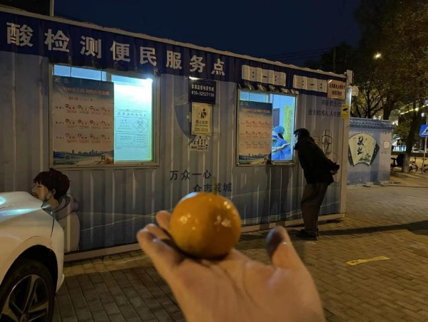 为验证传言的真实性,11月27日晚,记者随机找到一处核酸检测便民服务点,在食用了橘子约2分钟后,且在没有饮水及食用其他食物的情况下,参与了核酸采样。