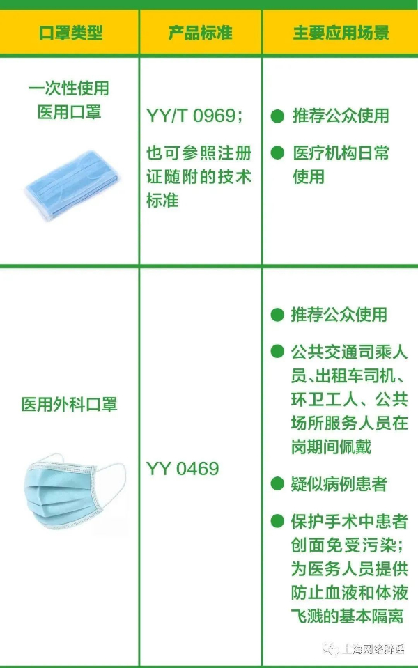 例如:产品标准YY 0469开头,那么它就属于医用外科口罩,适合公众使用。(其他口罩类型及适用场景见下表)