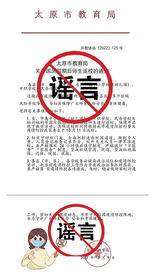 近日,部分家长群及个人朋友圈流传“关于国庆假期后太原市中小学生于10月11日返校”的虚假信息,在社会造成不良影响,现澄清如下: