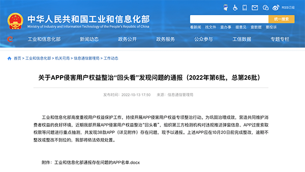 工业和信息化部高度重视用户权益保护工作,持续开展APP侵害用户权益专项整治行动。为巩固治理成效,营造共同维护消费者权益的良好环境,近期我部开展APP侵害用户权益整治“回头看”,组织第三方检测机构对违规推送弹窗信息、APP过度索取权限等问题进行重点抽测,共发现38款APP(详见附件)存在问题,现予以通报。上述APP应在10月20日前完成整改,逾期不整改或整改不到位的,我部将依法依规处置。
