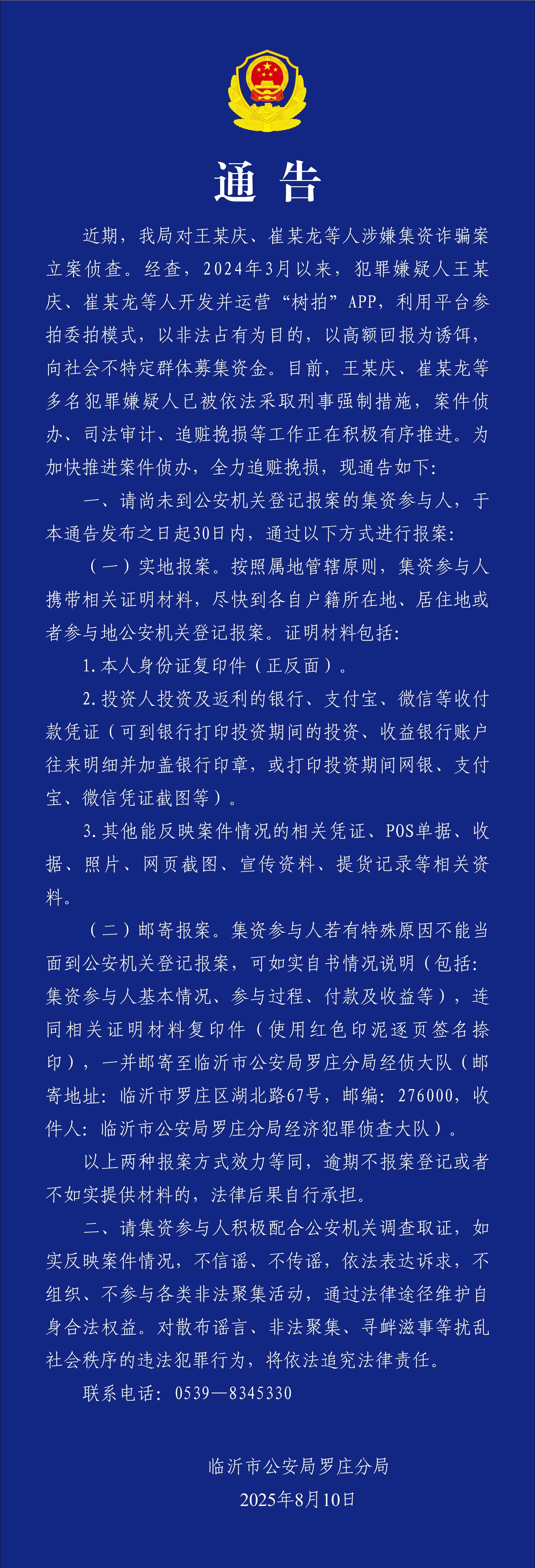 据“罗庄公安”微信公众号消息,山东临沂市公安局罗庄分局10日发布通告称,对王某庆、崔某龙等人涉嫌集资诈骗案立案侦查。经查,2024年3月以来,犯罪嫌疑人王某庆、崔某龙等人开发并运营“树拍”APP,利用平台参拍委拍模式,以非法占有为目的,以高额回报为诱饵,向社会不特定群体募集资金。