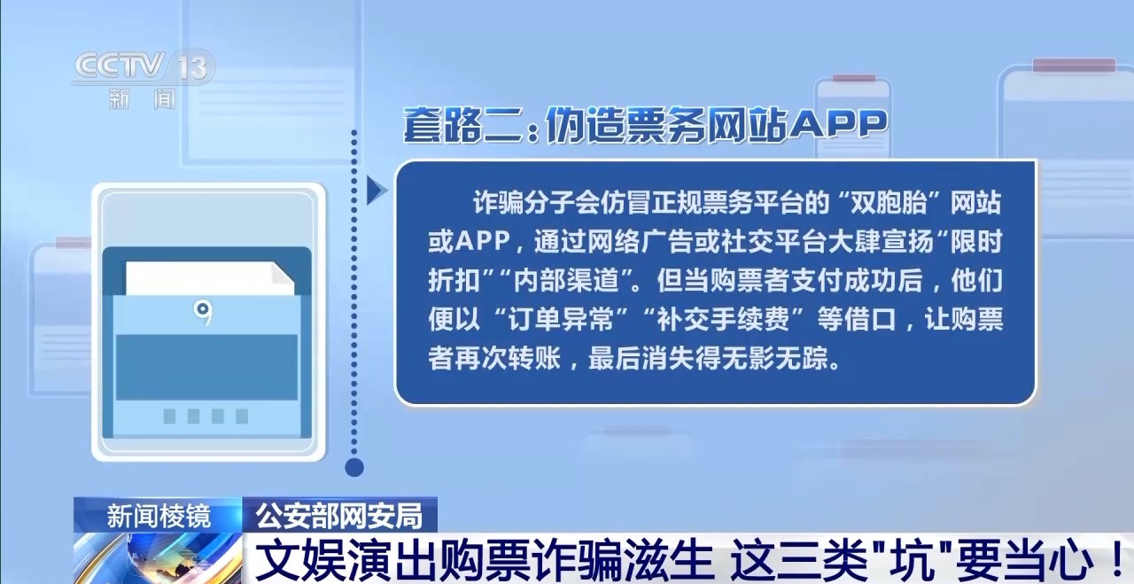 诈骗分子会仿冒正规票务平台的“双胞胎”网站或App,通过网络广告或社交平台大肆宣扬“限时折扣”“内部渠道”。但当购票者支付成功后,他们便以“订单异常”“补交手续费”等借口,让购票者再次转账,最后消失得无影无踪。